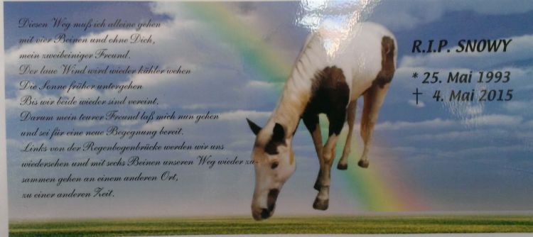 Seine glänzenden Augen werden wachsam, der Körper beginnt zu beben. Dann löst er sich plötzlich von der Gruppe, fliegt über das grüne Gras, wird schneller und schneller. Er hat DICH entdeckt, und wenn ihr euch trefft, feiert ihr ein glückliches Wiedersehen und wisst, daß nichts mehr euch wieder trennen kann. Glücklich küsst ihr euch, du streichelst wieder und wieder den liebgewordenen Kopf, schaust tief in diese Augen, die so lange von deinem Leben getrennt, aber nie aus deinem Herzen verschwunden waren. Und dann überquert ihr gemeinsam die Regenbogen-Brücke...
